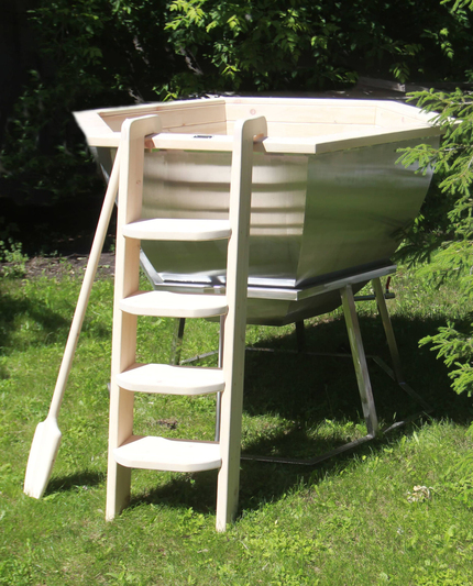 Банный чан из нержавеющей стали Ø-1750 на подставке с приставной печью Банный чан с приставной печкой изготовлен из пищевой стали. Представляет собой большую ёмкость в виде чаши, при нагревании которой можно париться на свежем воздухе. Чан установлен на устойчивую металлическую подставку и оснащен приставной печью с дымоходом. Банный чан оборудован кедровым бортом, скамейками, подспинниками, трапом для ног и приставной лестницей.