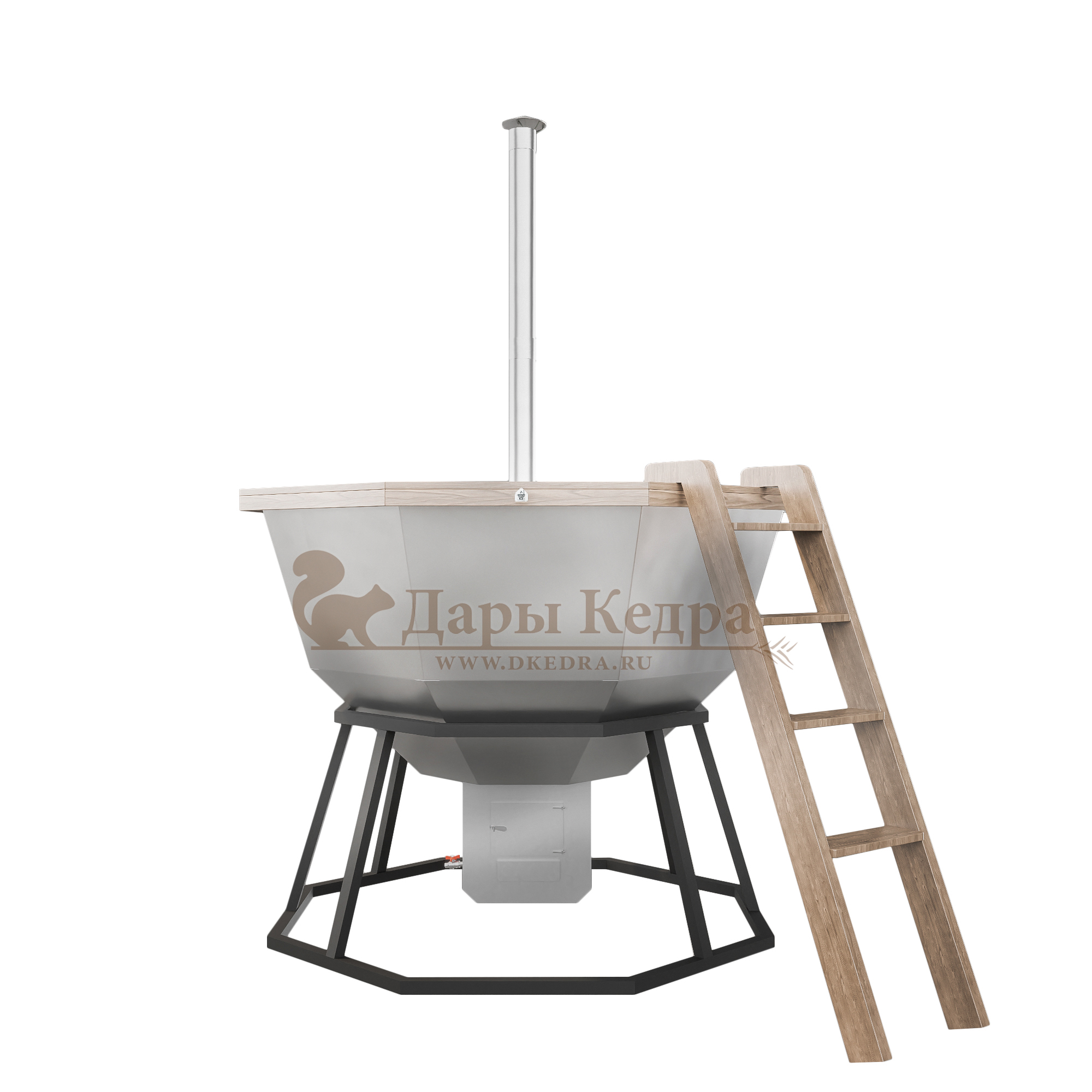 Банный чан из нержавеющей стали Ø-2000 на подставке с приварной печью с водяной рубашкой Банный чан с приварной печью печкой изготовлен из пищевой стали. Представляет собой большую ёмкость в виде чаши, при нагревании которой можно париться на свежем воздухе. Банный чан установлен на металлическую подставку и оснащен приварной печью с водяной рубашкой. Благодаря циркулирующей внутри печи воде чан быстрее нагревается и медленнее остывает. В комплект такой модели входит трёхметровый разборный дымоход. Чан оборудован кедровым бортом, скамейками, подспинниками, трапом для ног и приставной лестницей.