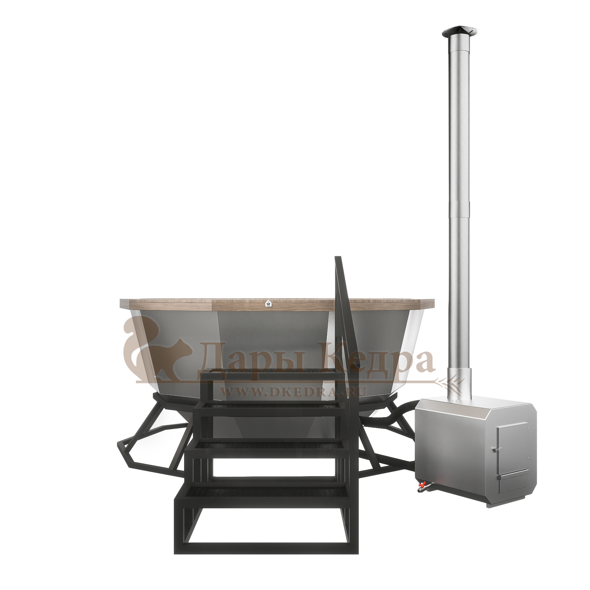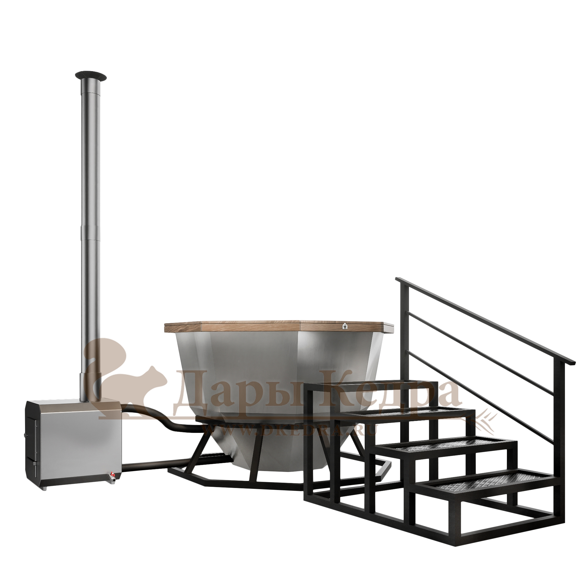 Банный чан из нержавеющей стали Ø-2000 на подставке с приварной печью с водяной рубашкой Банный чан с приварной печью печкой изготовлен из пищевой стали. Представляет собой большую ёмкость в виде чаши, при нагревании которой можно париться на свежем воздухе. Банный чан установлен на металлическую подставку и оснащен приварной печью с водяной рубашкой. Благодаря циркулирующей внутри печи воде чан быстрее нагревается и медленнее остывает. В комплект такой модели входит трёхметровый разборный дымоход. Чан оборудован кедровым бортом, скамейками, подспинниками, трапом для ног и приставной лестницей.