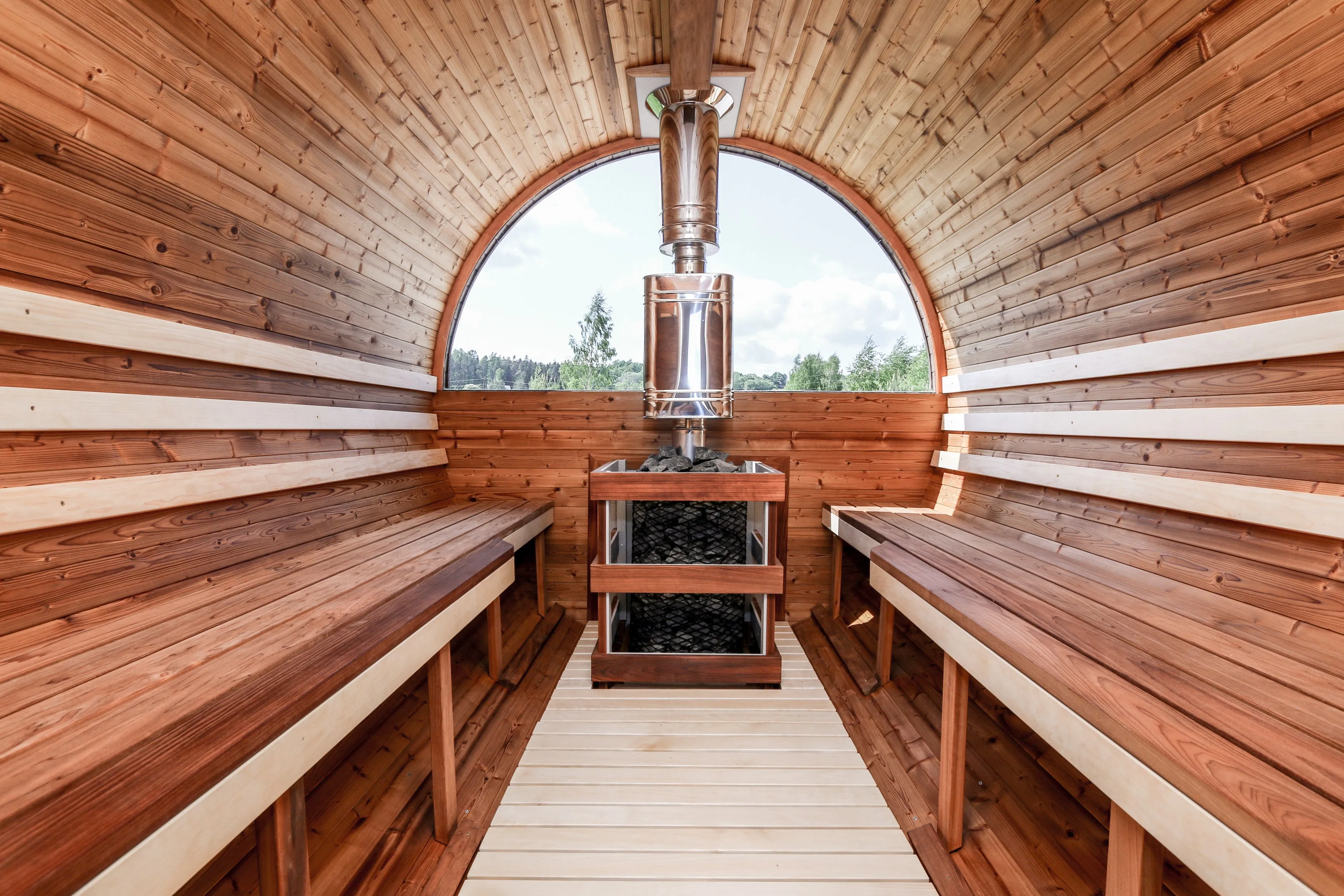 Боковой вход у такой модели находится в начале или в середине конструкции. В увеличенные модели можно повесить полочки и вешалки из кедра. Время растопки такой бани не превышает 30 минут. По вашему желанию баню-бочку можно дополнить печью с внешней загрузкой, благодаря которой весь мусор после топки останется на улице. Круглая баня-бочка не требует полноценный фундамент, поэтому при необходимости ее можно перенести в другое место.