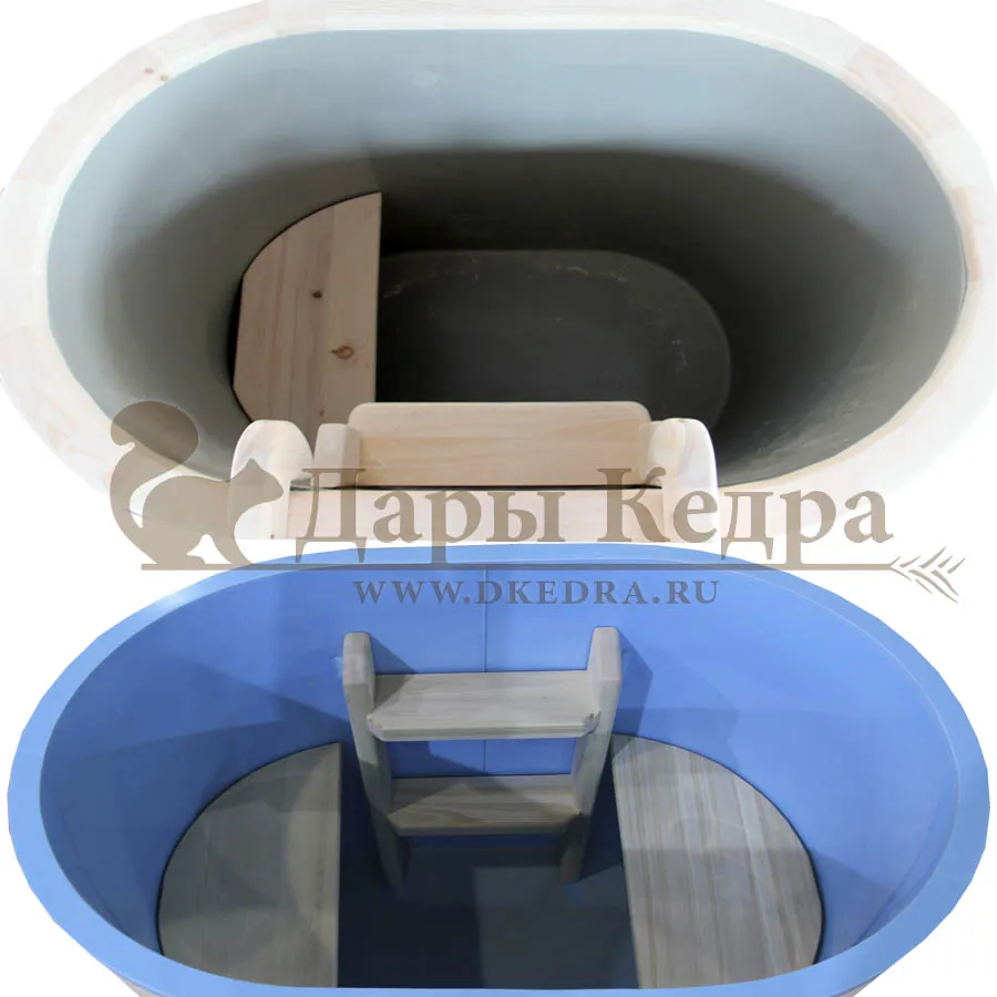 Это емкость для воды с овальной пластиковой чашей. Купель предназначена для отдыха и охлаждения тела после процедур парения. Подходит для уличного и комнатного использования. Для удобства пользования овальная купель с пластиковой вставкой оснащена лавочками, приставной и внутренней лестницей из кедра.