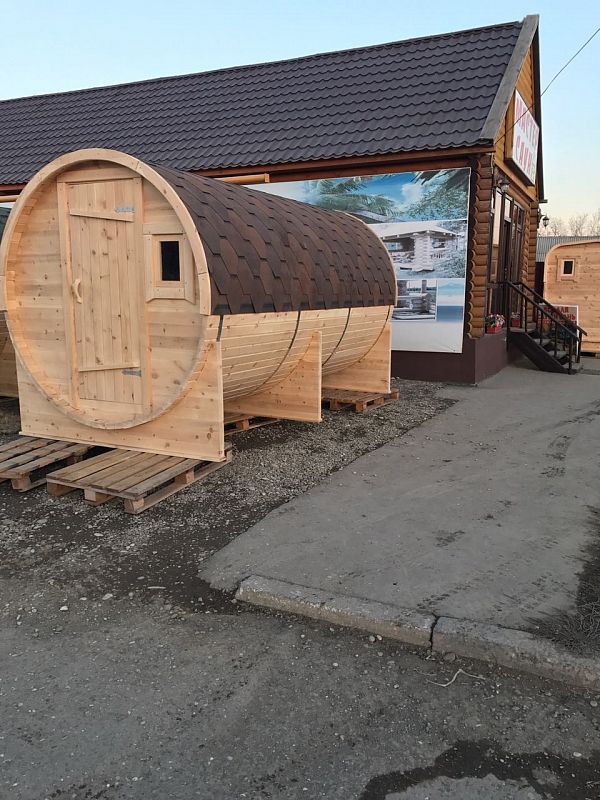 Баня-бочка круглая из кедра 3 метра Это изделие круглой вытянутой формы с двумя отделениями: раздевалкой и парной. Лавочки из кедра находятся по всей длине бани-бочки с обеих сторон. Печь расположена в парилке около дальней стены. Для удобства пользования в раздевалке установлена вешалка и полочка из кедра. За счет небольшой конструкции баня нагревается не более 30 минут. По вашему желанию баню-бочку можно дополнить печью с внешней загрузкой, благодаря которой весь мусор после топки останется на улице. Круглая баня-бочка не требует полноценный фундамент, поэтому при необходимости ее можно перенести в другое место. Обращаем Ваше внимание, что в стандартную комплектацию бани входят лавки в парной с обеих сторон. Дополнительно можно заказать полок открытого или закрытого типа! Кедр обладает ароматическими свойствами. Он не деформируется и влагоустойчив, при правильном уходе за деревом на нем не развиваются грибки и плесень.