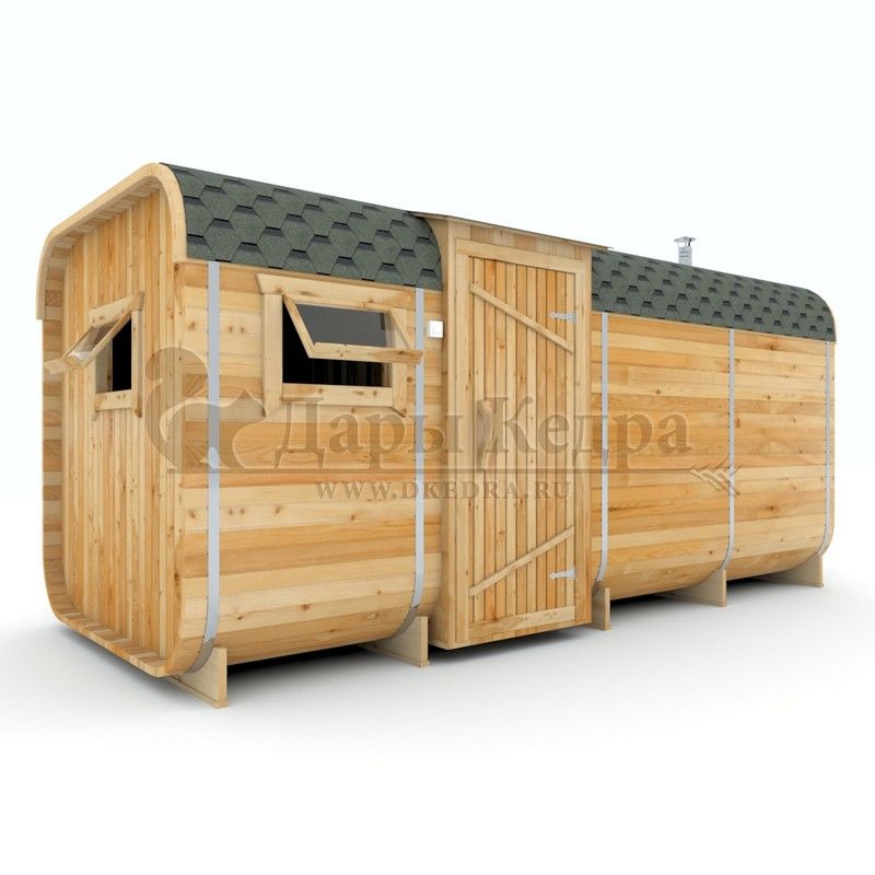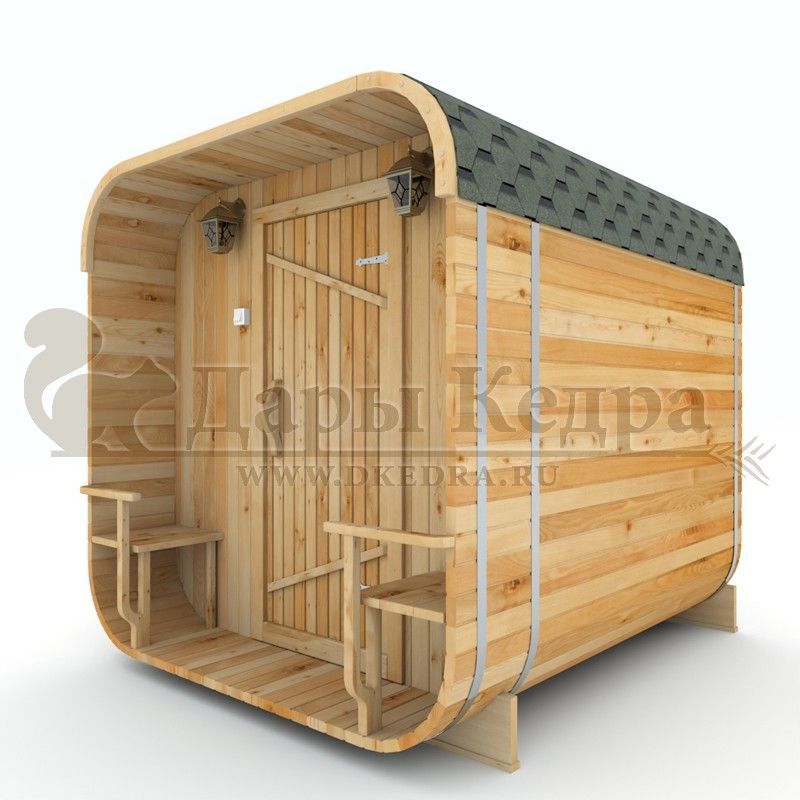 • Баня-бочка квадро из кедра с козырьком (все размеры) Это прямоугольное изделие с закругленными углами. За счет такой конструкции во время топки воздух циркулирует по кругу, поэтому баня-бочка нагревается не более 30 минут. Козырек не только украшает баню, но и защищает оставленную обувь от дождя. Лавочки из кедра находятся по всей длине бани-бочки с обеих сторон. Печь расположена в парилке около дальней стены. В зависимости от выбранного размера баня-бочка квадро с козырьком имеет следующую комплектацию: Баня-бочка квадро 2,5 метра - парилка; Баня-бочка квадро 3,5 и 4,5 метра - раздевалка, парилка; Баня-бочка квадро 5,5 метров - раздевалка, парилка, моечная. По вашему желанию ее можно укомплектовать печью с внешней загрузкой, благодаря которой весь мусор вовремя топки остается на улице. Баня-бочка квадро не требует полноценный фундамент, поэтому при необходимости ее можно перенести в другое место. Обращаем Ваше внимание, что в стандартную комплектацию бани входят лавки в парной с обеих сторон. Дополнительно можно заказать полок открытого или закрытого типа! Кедр обладает ароматическими свойствами. Он не деформируется и влагоустойчив, при правильном уходе за деревом на нем не развиваются грибки и плесень. Обращаем Ваше внимание, что данную модель бани-бочки можно изготовить с ровным полом. Эта дополнительная опция и оплачивается отдельно!