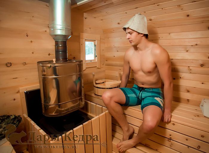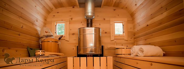 На крыше располагается гибкая черепица, цвет можно выбрать (зеленый, коричневый, бордовый). Для корректной эксплуатации изделия после зимы обручи рекомендуется подтягивать. Они также входят в комплектацию и являются обязательной частью кедровой парилки. Если она поставляется в сборном виде, то вся проводка внутри бани уже проведена нашими специалистами. Если баня поставляется клиенту в разобранном виде, то подключение осуществляется заказчиком самостоятельно на месте по инструкции от производителя.