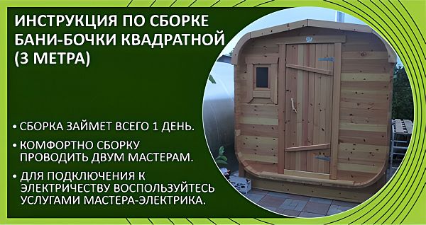 На крыше располагается гибкая черепица, цвет можно выбрать (зеленый, коричневый, бордовый). Для корректной эксплуатации изделия после зимы обручи рекомендуется подтягивать. Они также входят в комплектацию и являются обязательной частью кедровой парилки. Если она поставляется в сборном виде, то вся проводка внутри бани уже проведена нашими специалистами. Если баня поставляется клиенту в разобранном виде, то подключение осуществляется заказчиком самостоятельно на месте по инструкции от производителя.